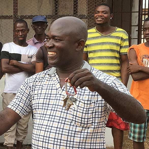 Abdul Karim Mustapha, Director of Mattru Jong Hospital, symbolically receives the keys to the hospital. Abdul was installed as hospital Administration in 2019 after serving as the business manager for the water and solar power at the hospital.